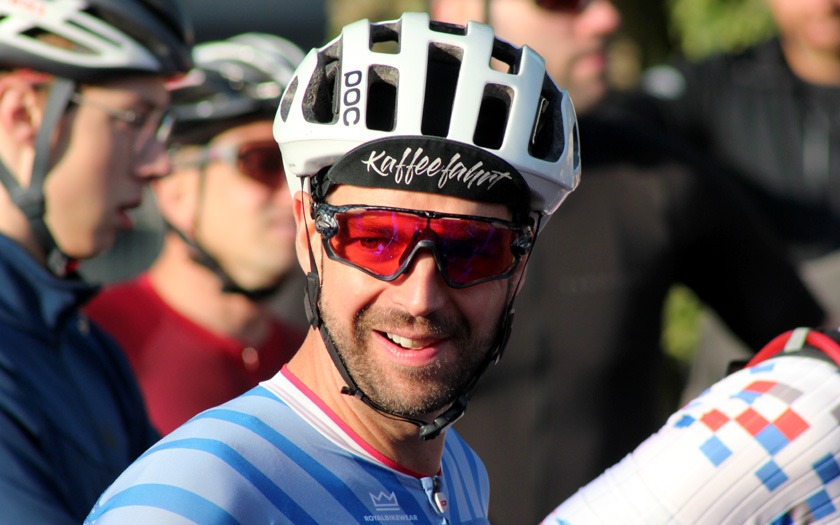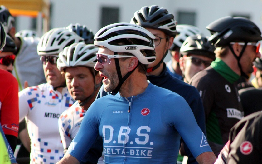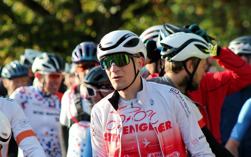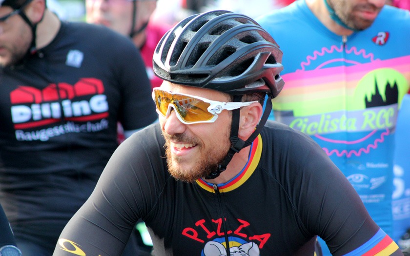 Jeder Starter unterstützt: Ein Teil des Startgeldes geht traditionell an die Tour der Hoffnung, die sich für kranke Kinder und Jugendliche engagiert. Wolfgang Rinn, im Trikot der Tour der Hoffnung, ist langjähriger Unterstützer und Mitwirkender der Tour. Foto: Stephan Dietel