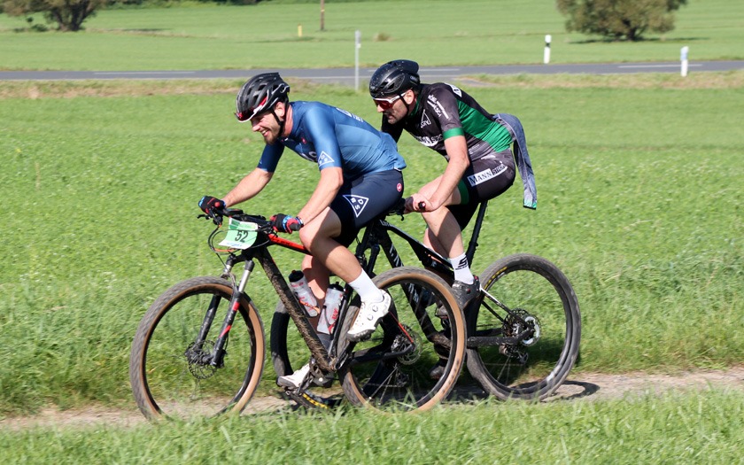 Vereint biken und berichten: Der stellvertretende Radsportnachrichten.com-Redaktionsleiter und Mountainbike-Ressortleiter Matthias Steinberger (links) kam ebenso nicht ungesehen an unserem Fotograf vorbei wie Leander Otto (rechts) vom AMC Rodheim-Bieber. Foto: Stephan Dietel