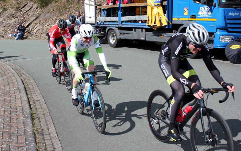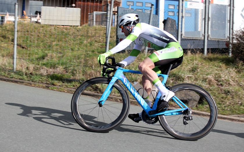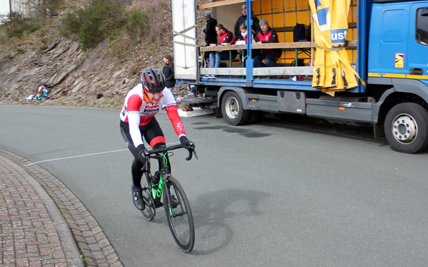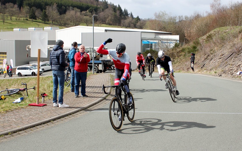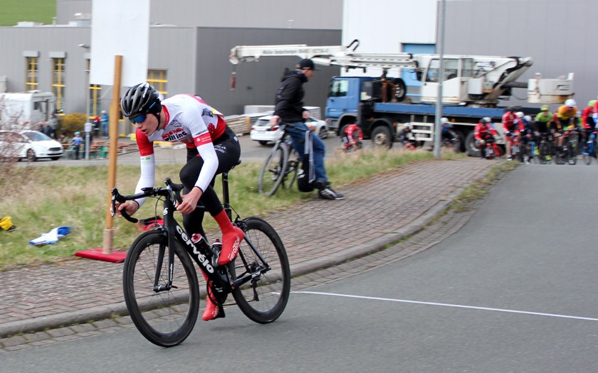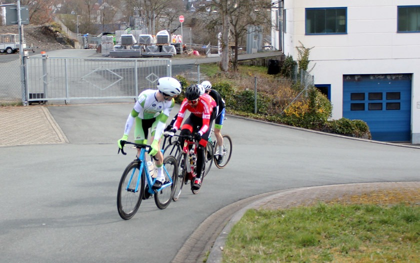 Den frühen Ausreißversuch des Duos erkannte Florian Anders von der RSG Gießen und Wieseck sofort als Gefahr und Chance für sich und machte sich mit einigen Begleitern auf die Verfolgung. Es entwickelte sich eine Spitzengruppe, die gut harmonierte und ihren Vorsprung kontinuierlich ausbaute. Zeitweise waren es noch ein paar mehr Fahrer, doch die sehr selektive Strecke brachte sieben Namen hervor, die sich vorne etablieren konnten. Filipe Pereira Costa (Velo Solingen), Moritz Kaase (RSV Gütersloh), Patrick Alterfrohne (TV Friesen Telgte), Fynn Brestel (Kieler Radsportverein), Thorsten Piniek (RSV Düren), Martin Stahl (RSC Eifelland Mayen) und eben Florian Anders hatten damit den Grundstein gelegt, den Sieg unter sich auszumachen. Mit 1:50 Minute Vorsprung auf eine Verfolgergruppe gingen sie nach 29 Runden zum letzten Mal in den rund 200 Meter langen Anstieg bei Start und Ziel. Nach langer Zusammenarbeit war jetzt jeder auf sich alleine gestellt. Filipe Pereira Costa, der als einer der letzten den Sprung in die Spitzengruppe geschafft und damit vielleicht die größten Kraftreserven hatte, gewann vor Moritz Kaase und Patrick Alterfrohne. Florian Anders kam auf Rang sieben und war mit seinem Saisondebüt dennoch nicht unzufrieden. Die harten Kilometer an der Spitze dürften eine gute Vorbereitung für seinen weiteren Saisonverlauf sein, der ihn am 24. April zum German-Cycling-Cup im Rahmen der Tour d’Energie nach Göttingen führt und am 15. Mai beim Radrennen „Rund um das Stadttheater“ sein Heimrennen bereithält.