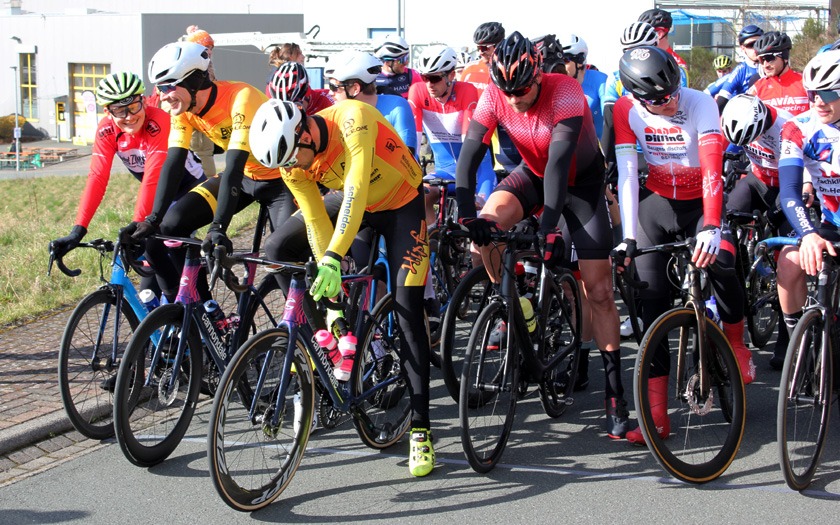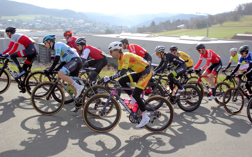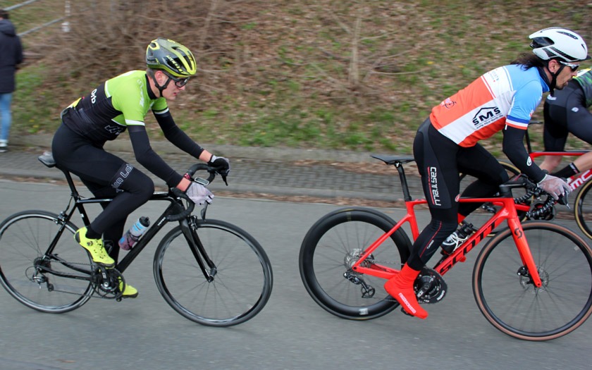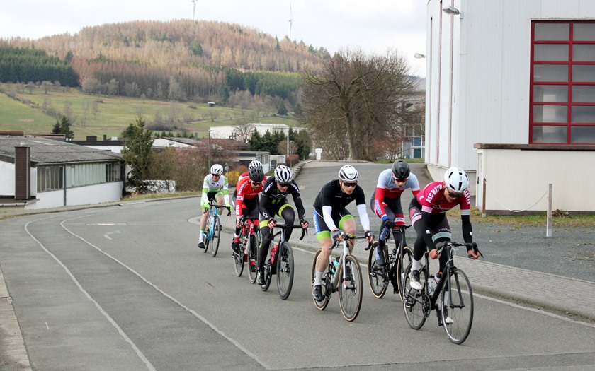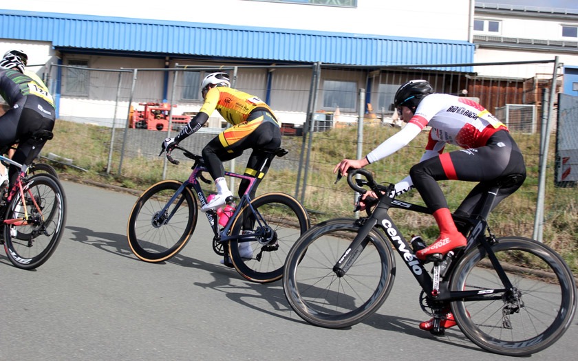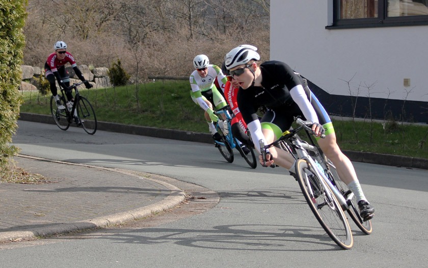 Schon in der zweiten Runde im Rennen der Männer Amateure setzten sich zwei Fahrer ab und man hätte diesen Vorstoß leicht falsch verstehen können. Es war weder Selbstüberschätzung oder der Versuch, bei Temperaturen knapp über dem Gefrierpunkt für zusätzliche Erwärmung zu sorgen, sondern vielmehr der Wunsch, sich auf dem winkligen und schnellen Rundkurs dem großen Pulk zu entziehen. „Das ist ein bisschen wie beim Motorradfahren im Frühjahr. Man muss sich erst wieder an das Fahren auf der Straße gewöhnen“, sagte Rennsport Fachwart Andreas Schulz von der RSG Buchenau vor dem Rennen. Zudem hätten viele Fahrer während der Corona-Situation keine oder nur wenige Radrennen bestritten und damit das Fahren im Peloton lange nicht mehr trainiert. Dass die Strecke mit ihren schnellen Kurven trocken blieb, dürfte ein Vorteil gewesen sein.