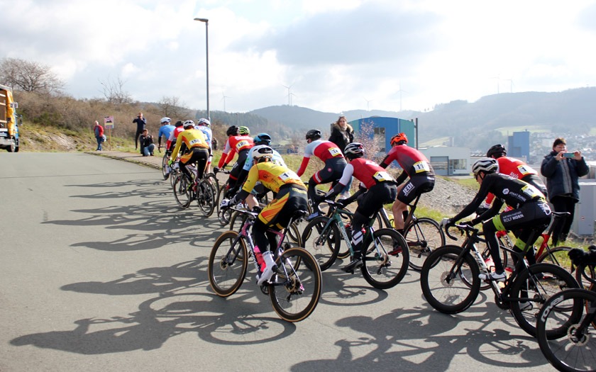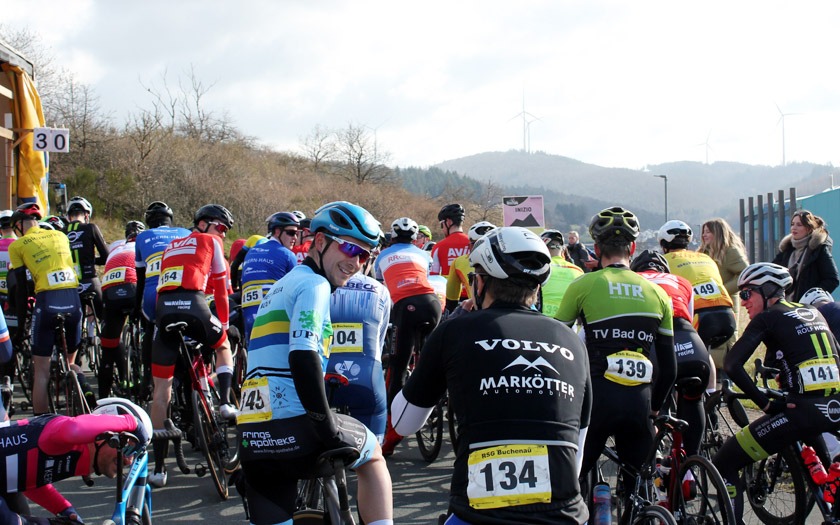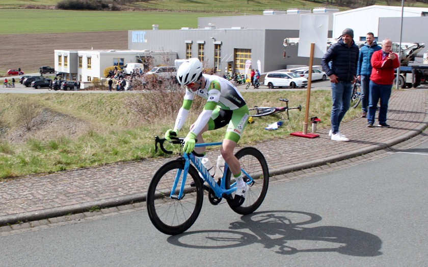 Auch die zweite Gruppe, die zwischen Spitze und Hauptfeld fuhr, sorgte für Begeisterung an der Strecke. In der zum Finale noch fünfköpfigen Verfolgergruppe, die zum Schluss 1:50 Minute hinter der Spitze und 20 Sekunden vor dem Hauptfeld fuhr, war Lokalmatador Marco Lautenschläger in den Farben der RSG Buchenau vertreten. Seine Tempoverschärfung im Anstieg bei Start und Ziel auf dem zwei Kilometer langen Rundkurs sorgte für Beifall unter den heimischen Zuschauenden. Er hätte schneller fahren wollen als seine Mitstreiter, doch der anspruchsvolle Rundkurs mit knapp 1.200 Höhenmetern auf den angesetzten 60 Rennkilometern, schnellen Kurven und starkem Wind auf den Flachstücken, machte einen Alleingang unmöglich und auch die Reihen im Hauptfeld hatten sich mit jeder zermürbenden Runde auf am Ende rund 25 verbliebene Fahrer gelichtet. Marco Lautenschläger schloss sein Saisondebüt auf Platz zehn ab. „Ich bin froh, noch stehen zu können“, fiel sein Fazit mit einem Schmunzeln aus. Das vor wenigen Tagen in neuen Farben erschienene Trikot des RSV Marburg, das in stattlicher Zahl im Starterfeld vertreten war, wurde durch Lasse Schier auf Platz 21 auf den vereinsintern vordersten Rang gebracht. 60 Kilometer auf dem Kurs seien „wirklich eklig“ gewesen, fasste Daniel Schulz-Thomé von der RSG Buchenau zusammen, der auf Platz 22 sehr solide ankam und mit seinem Wiedereintritt in den Wettkampfbetrieb und dem mannschaftlichen Auftritt sehr zufrieden war. Hinter ihm auf Platz 23 versprach mit Daniel Müller ein weiterer Rennsport-Rückkehrer der RSG, dass man ihn in dieser Saison jetzt wieder öfter sehen werde.