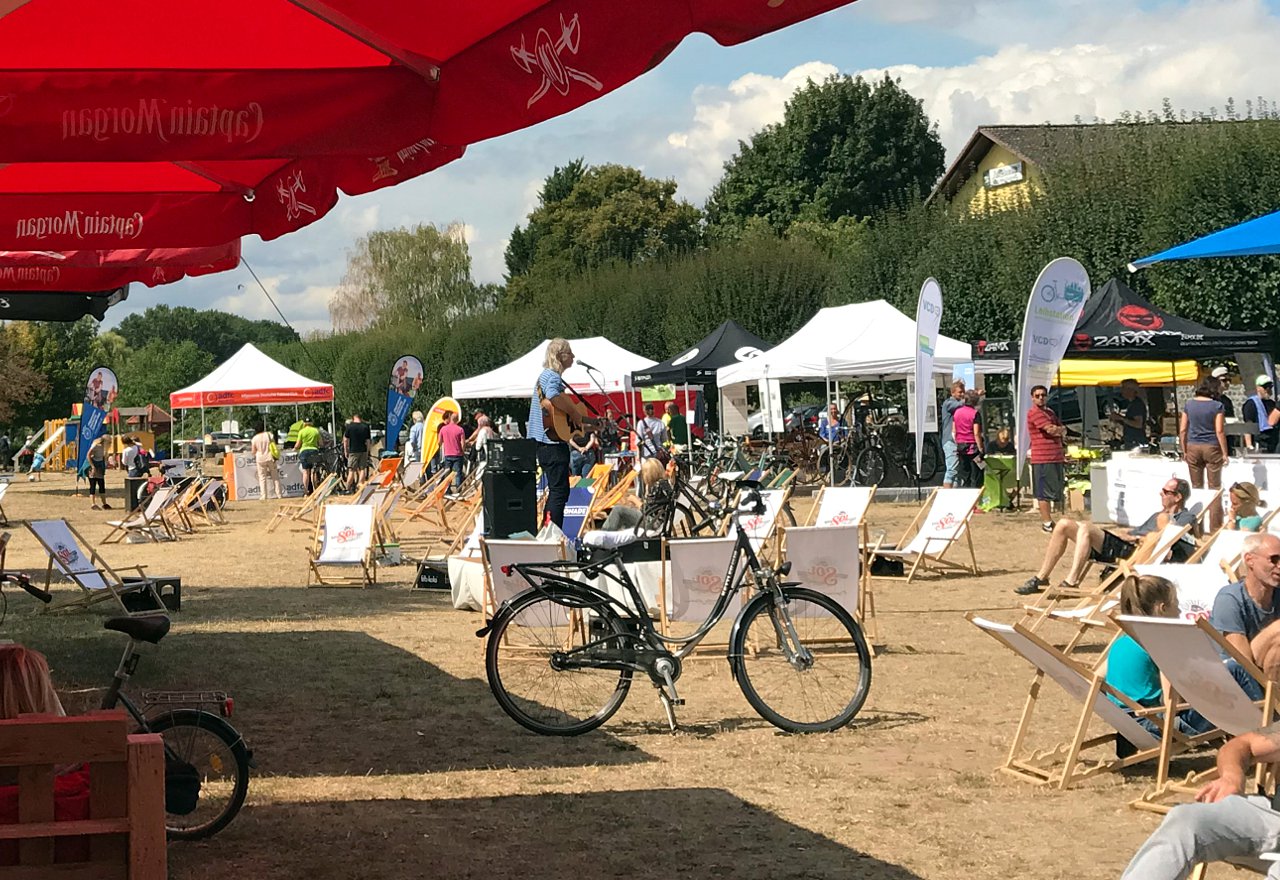 Zum Auftakt in Maintal traf man sich natürlich am Main. Die Openair-Lounge MAIN KULTUR bot dafür zwischen Radweg und Uferpromenade den passenden Rahmen. Organisationen, Firmen und Vereine präsentierten Themen rund ums Rad und die bewusste Alltagsmobiltät. Mit Blick aufs Wasser war pausieren, informieren oder diskutieren ausdrücklich erwünscht. Maintals Bürgermeisterin Monika Böttcher freute sich zur Eröffnung über viele Besucher und ganz besonders über eine Delegation Radfahrer aus Hanau: Dort sammelt man bereits seit einigen Tagen Fahrradkilometer für das Stadtradeln und hat mit der Stadt Maintal jetzt eine Wette um die meisten Kilometer laufen. Ein besonderes Wertungsschema nimmt Bezug zur Teilnehmerzahl und gleicht damit den Größenunterschied zwischen beiden Städte aus.