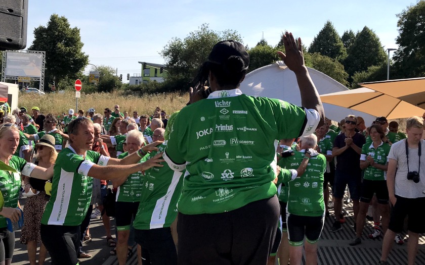 Bei 33 Grad, 55 Kilometern auf dem Fahrrad und zehn Stopps mit Spendenübergaben waren die 150 Teilnehmenden am Ende zwar müde, aber glücklich. Dazu trug neben den vielen Förderern des Vereins und seiner Arbeit für krebskranke Kinder auch Sängerin Shondell bei, die den Tour-Tross, seine Gastgeber und das Team der Begleitenden mit erstklassigem Gesang im wieder zum Tanzen verleitete. Die Menschenmenge war in Feierlaune – die Arbeit der zurückliegenden Wochen schien vergessen und um ein Vielfaches mehr belohnt worden zu sein. Die Tour der Hoffnung hatte sich, nach dem Tod ihres jahrzehntelangen Organisationsleiters im Februar diesen Jahres, in vielen Dingen neu aufstellen müssen. So war der Abschluss der 1. Etappe, die traditionell rund um Gießen in Mittelhessen stattfindet, die gelungene Ankunft in einem neuen historischen Abschnitt der Tour der Hoffnung. Zum Song „We are Family“ von Sängerin Shondell dürften alle Teilnehmenden das besondere Gefühl des Zusammenhalts und den Antrieb für die Gute Sache, zu Gunsten krebskranker Kinder, gespürt haben.