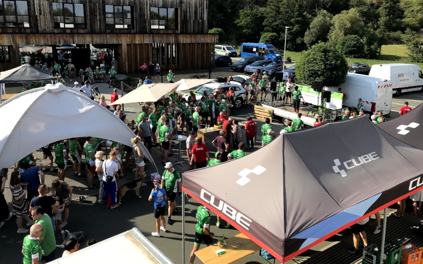 Thomas Langner, Inhaber des Delta Bike CUBE-Store Gießen freute sich, der Tour der Hoffnung mit den benachbarten und befreundeten Unternehmen, dem Planungsbüro Fischer und dem Ingenieurbüro Zick-Hessler, der Auftaktetappe der Tour der Hoffnung einen tollen Empfang zu bereiten, wie unser Vorschau-Video zeigte. Sie nahmen die Tour-Familie, wie sich die Teilnehmenden der Tour der Hoffnung gerne nennen, im wörtlichen Sinne in ihre Mitte. Zwischen den Gebäuden der drei Unternehmen im Nordpark Wettenberg entstand ein Festplatz, auf dem zum Abschluss des ersten Tour-Tages ein Fahrradfest entbrannte.
