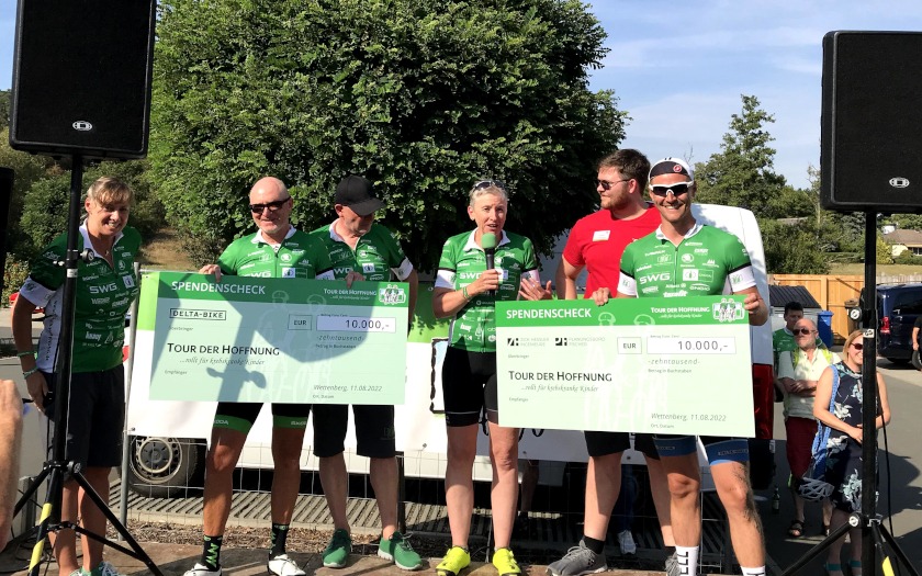 Auf zwei weiteren Etappen über jeweils knapp 100 Kilometer transportierte die Tour der Hoffnung 2022 ihre Botschaft dann durch den südlichen Teil des Rhein-Main-Gebiets und durch die nordöstliche Region Hessens, zum Ziel in der Domstadt Fulda, wo am Samstagabend (13.08.) dann auch die Gesamtsumme der Spenden auf den drei Etappen verkündet werden dürfte.