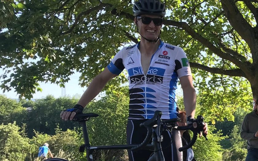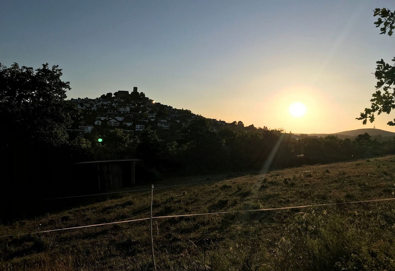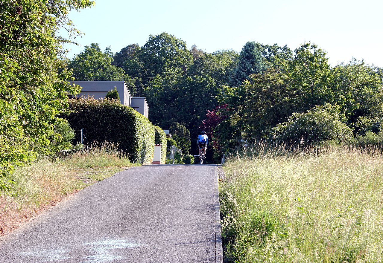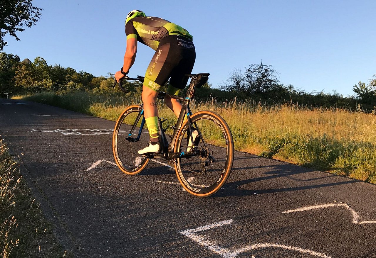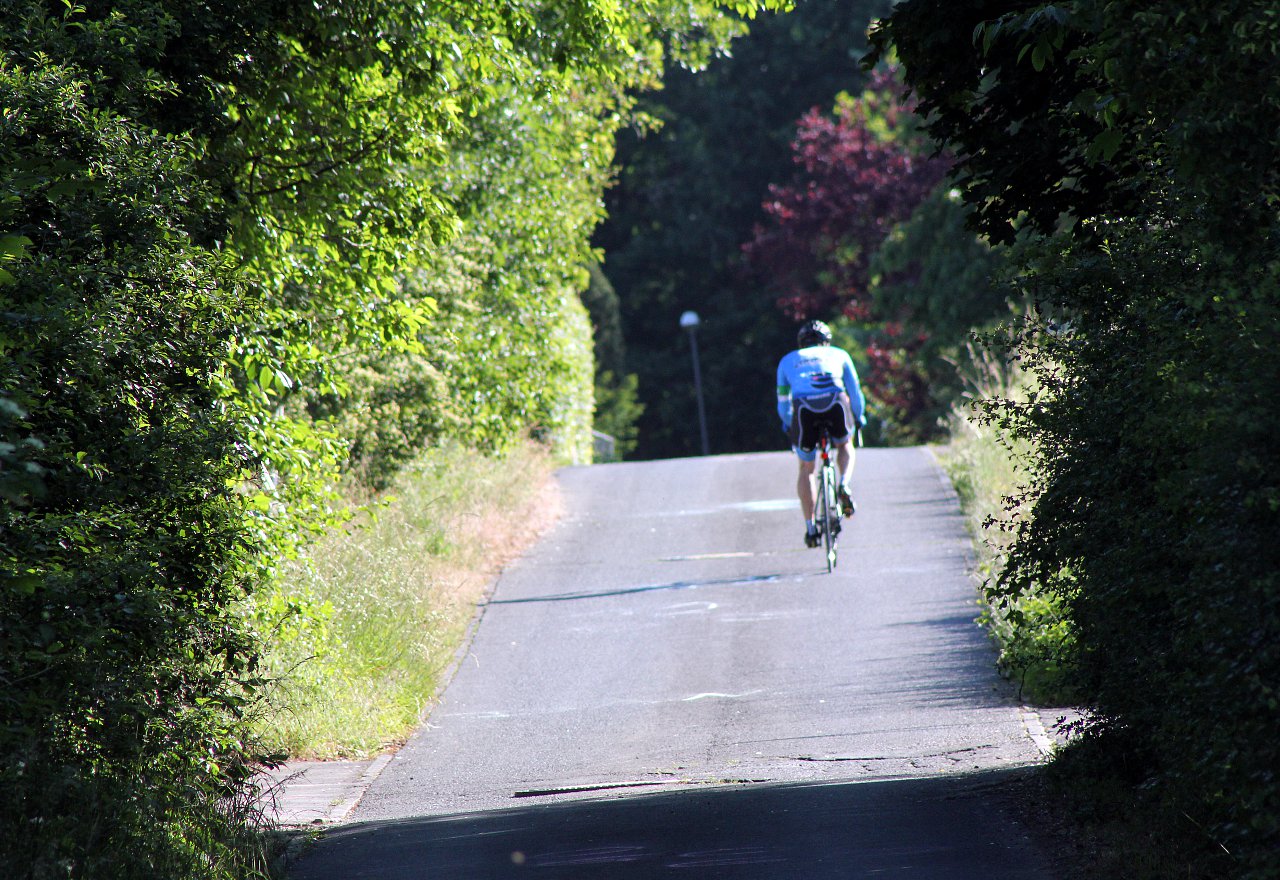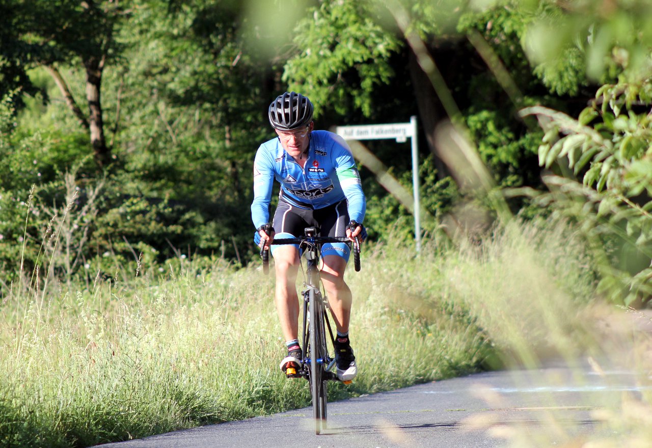 Außer Staub auf den Bremsen gab es auch aus technischer Sicht keine besonderen Vorkommnisse beim Everesting in Krofdorf-Gleiberg. Rund dreieinhalb Minuten, in der Spitze nur 3:11 Minuten und am Ende rund 3:50 Minuten, brauchte Mauser für eine Runde bergauf und bergab, bevor es an der Wende wieder in den Anstieg ging. Um 17:08 Uhr waren dann 186 Passagen bergauf absolviert und 8.864 Höhenmeter in Mausers Beinen. Und wie es sich für einen Extrem-Radsportler gehört, ging das erfolgreiche Everesting in Mittelhessen dann zu Ende: „Jetzt machen wir die 10.000 Höhenmeter auch noch voll“, verabschiedete er sich mit zwei Sportkameraden auf seine Ehrenrunden in der Abendsonne am Falkenberg. (Text: sd | Foto: Stephan Dietel)