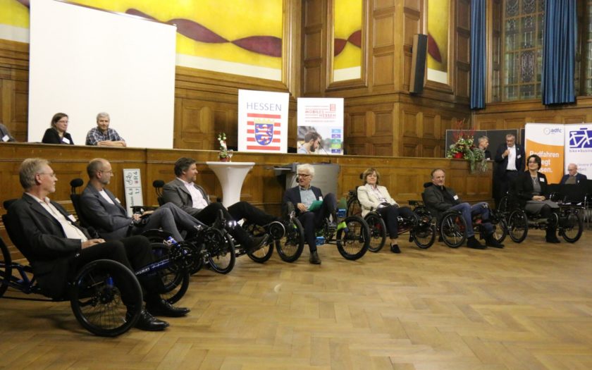 Die Gesprächsteilnehmer, unter ihnen Paul Hollants, Geschäftsführer von HP Velotechnik, würdigten die Projekte, formulierten aber auch klare Statements und Aufgaben an die Politik für mehr Förderung des Radverkehrs. Hollants, der für die außergewöhnliche „Bestuhlung“ des Podiums verantwortlich war, wies dabei auf das große Potenzial gerade von E-Bikes hin und forderte: „Tempo 30 sowohl für Rad als auch Auto in der Stadt sind machbar.“ Zudem müssten mehr Park- und Abstellmöglichkeiten für Räder geschaffen werden. Unterstützung erhielt der Fahrradbauer von der Verkehrswissenschaftlerin Prof. Dr.-Ing. Petra Schäfer. Sie erläuterte, dass ihr Team an der Frankfurt University of Applied Sciences in beratender Funktion für die Politik zuletzt dem Ansinnen der Autolobby nach mehr Platz entgegen getreten sei. Der Applaus der Gäste war ihr gewiss.