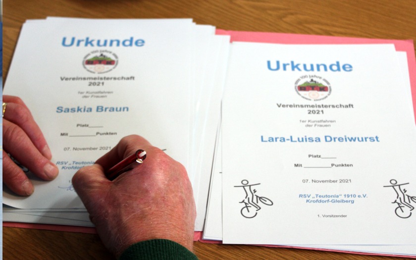 Mit den Darbietungen von Lara-Luisa Dreiwurst und Saskia Braun im 1er und 2er Kunstradsport, sowie der Kür von Carla Grolle im 1er der Juniorinnen, die vielen der jüngsten Sportlerinnen als Vorbilder dienen, wurde die Vereinsmeisterschaft nach rund vier Stunden mit einer Siegerehrung für alle abgeschlossen. Darüber, dass man alle Sportlerinnen trotz der langen Wettkampfpause behalten und obendrein noch neue dazu gewinnen konnte, freuten sich die Vorstandsmitglieder und Fachwartinnen des RSV Krofdorf-Gleiberg mindestens genauso, wie die Sportlerinnen über ihre Urkunde für diese besonders bedeutsame Veranstaltung.