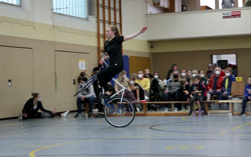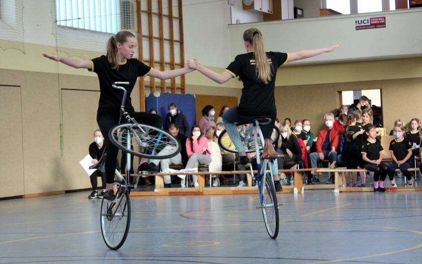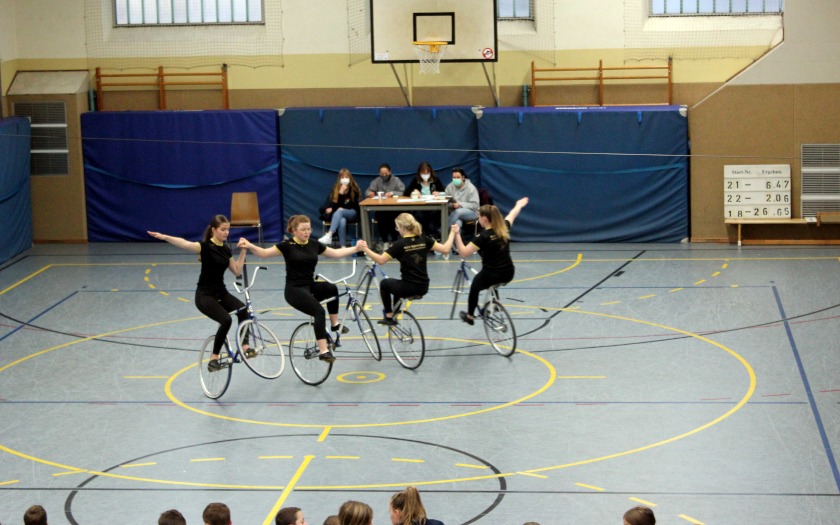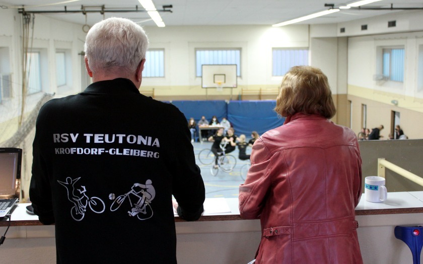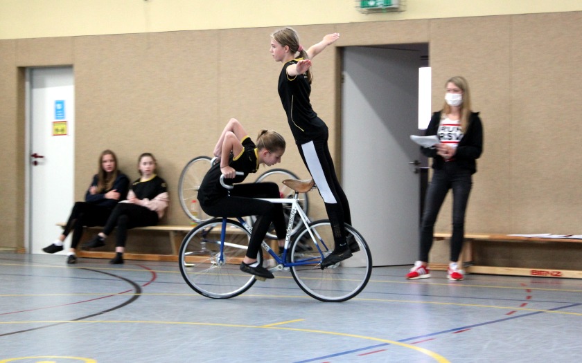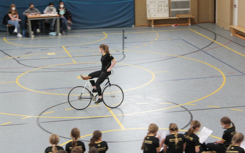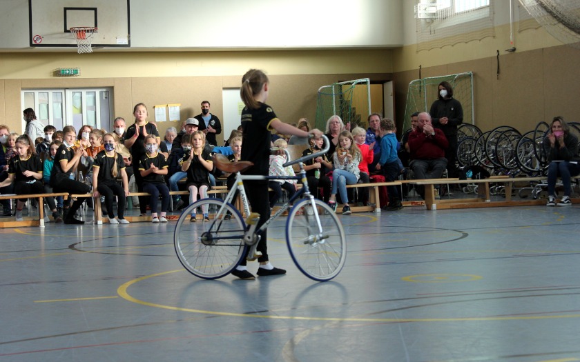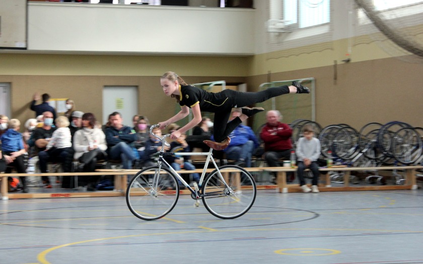 Die Vereinsmeisterschaft im Kunstradsport war jetzt eine der ersten Gelegenheiten, wieder einen Wettkampf in dieser Disziplin des Hallenradsports zu bestreiten. Mit einem Programm von 30 Starts im 1er, 2er, 4er und 6er Kunstradsport, konnte man sich auf ein großes Starterfeld freuen. „Bei den Schülerinnen U9 und U11 hatten wir ein großes Starterfeld, die fast alle zum ersten Mal bei einem Wettkampf teilgenommen haben. Sie zeigten schöne Leistungen und mussten erstmals lernen, wie es ist, ganz alleine auf der Fläche zu sein und, dass alle Augen auf sie gerichtet sind“, beschrieb Christine Müller, die 1. Fachwartin für Kunstradsport, die Herausforderung der Meisterschaft für die jüngsten Sportlerinnen. Zusammen mit der 2. Fachwartin, Renate „Bonny“ Krönlein, nutzte Müller die Gelegenheit, den Lesenden und Zuschauenden von Radsportnachrichten.com die speziellen Fahrräder für das Kunstradfahren und den Wettkampfmodus vorzustellen, denn als Disziplin des Hallenradsports ist ein zufälliges Kennenlernen dieser Sportart für Außenstehende eher selten.