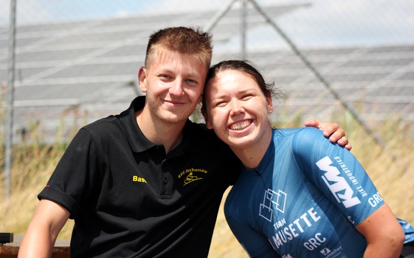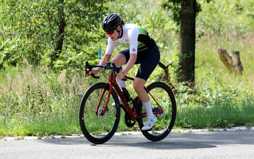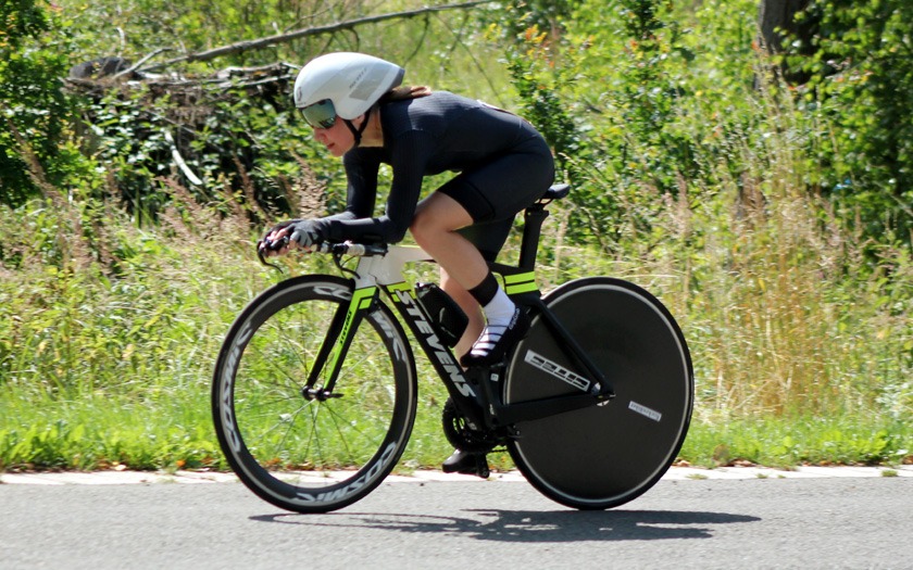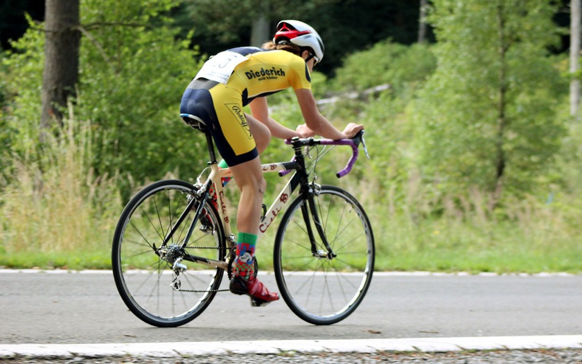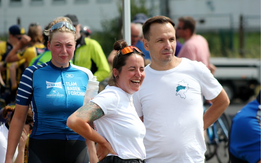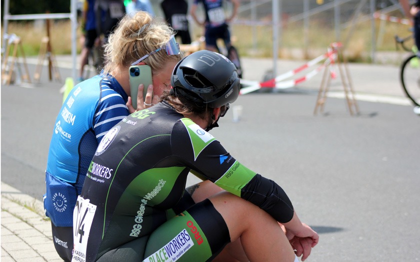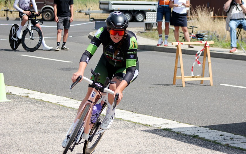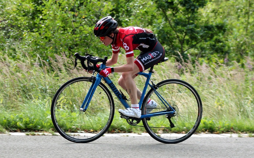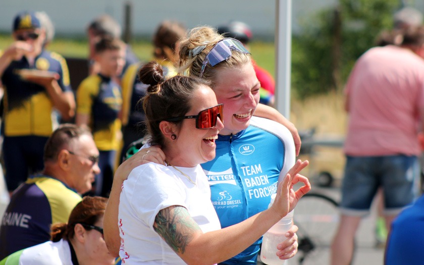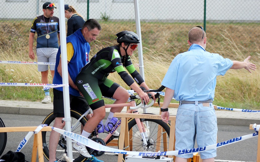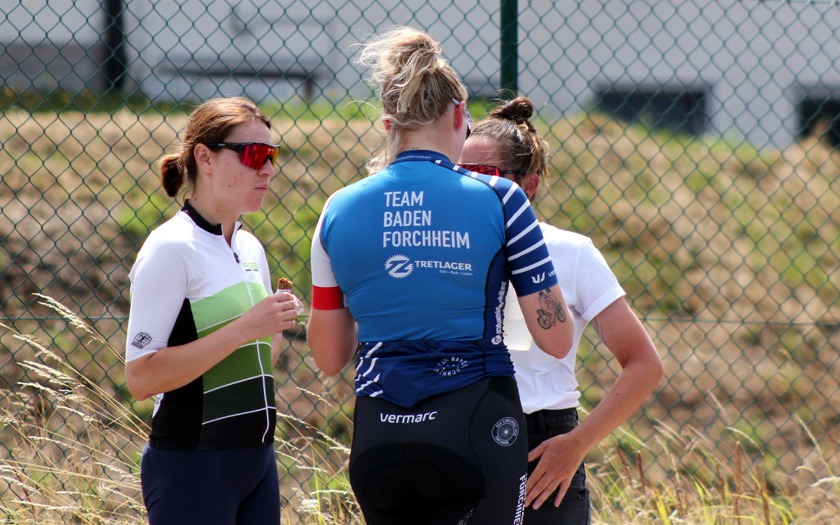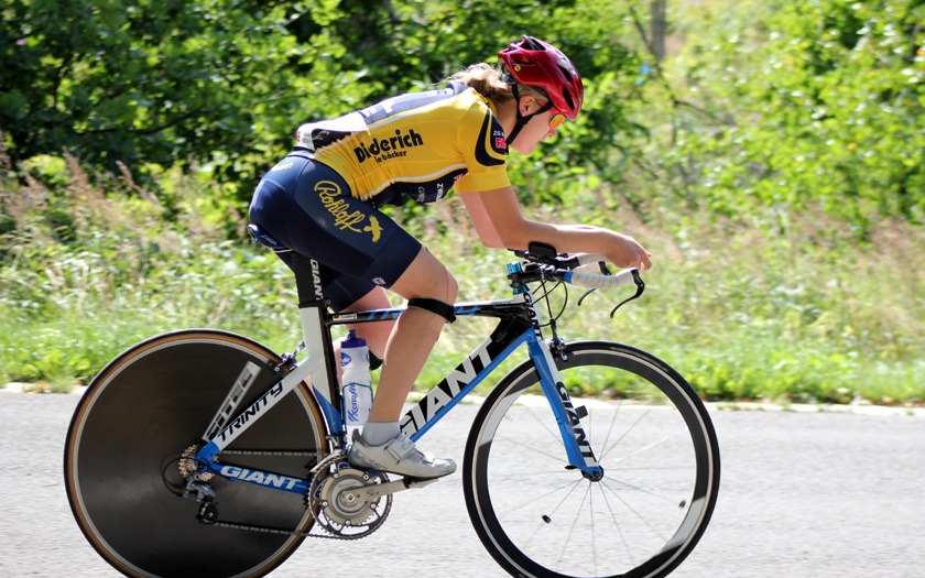 Der Wind auf der welligen Strecke nahm weiter zu, als die Frauen um ihre Hessenmeisterschaft fuhren. Die in Gießen lebende Nina Schmidt, die für den RSC Wiesbaden und das Team Baden-Forchheim fährt, lag an der Zwischenzeit nach zehn Kilometer mit 15:20,20 Minuten in Führung. Der Wind habe ihr Rad vor dem Wendepunkt im Wald einmal deutlich zur Seite versetzt, berichtete die Wahl-Gießenerin, die sich dann sehr bemühen musste, den aerodynamischen Zeitfahrlenker auf Kurs zu halten. Neun Sekunden mehr hatte Sabrina Müller vom SSV Bunstruth zur Halbzeit an dieser Stelle auf der Uhr. Vanessa Nieminen von der RSG Gießen und Wieseck stand zu diesem Zeitpunkt mit 16:42,39 Minuten auf dem Bronze-Rang der Hessenmeisterschaft. Doch auch hier folgte eine zweite, zehn Kilometer lange Runde, die das Podium noch durcheinander wirbeln sollte. In 31:18,34 Minuten wurde Sabrina Müller, im dritten Jahr ihrer Radsport-Laufbahn, neue Hessenmeisterin der Frauen vor Nina Schmidt, die nach 20 Kilometern mit lediglich 0,85 Sekunden Rückstand zur Vize-Hessenmeisterin wurde. Die Bronze-Medaille gewann Anja Schneidenbach mit 33:57,90 Minuten Fahrzeit, die sich zur Siegerehrung, etwas überrascht, aber sehr erfreut, noch rasch ihr Vereinstrikot von der RVG Rockenberg überstreifte. Mit zwei Sekunden Rückstand Vierte geworden zu sein, nahm Vanessa Nimenen mit einem Lächeln als Ansporn für das Training bis zur nächsten Hessenmeisterschaft im Einzelzeitfahren.